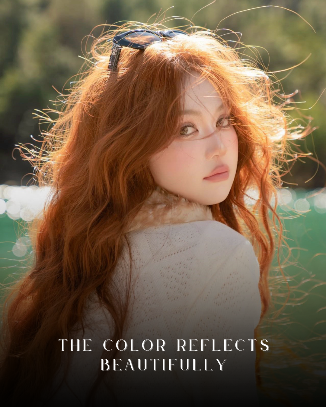 Ánh nắng chiếu vào tóc tạo ra hiệu ứng phản quang nhẹ, lớp cam cháy hiện lên rất sâu — không chói, không gắt, nhưng đủ để người đối diện phải nhìn thêm lần nữa.